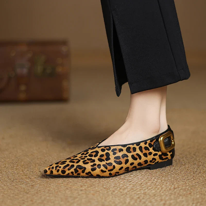 Die Cavallia Pointed Flats, handgefertigt aus hochwertigem Rindsleder mit eleganter, spitzer Zehenpartie, definieren alltägliche Raffinesse neu. Die Krokodilprägung harmoniert perfekt mit dem markanten goldenen Schnallendetail, während das Futter und die Innensohle aus Lammfell für weichen, atmungsaktiven Tragekomfort sorgen.